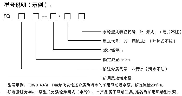 特點: FQW(原BQF型)礦用風動潛水泵,該泵以壓縮空氣為動力,采用離心泵結構形式。具有體積小,重量輕,結構簡單,安裝維修方便,在含有瓦斯與煤塵的礦井中使用安全可靠,是一種先進的風動排水設備。