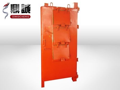 2.門扇上部裝有三組通風活門裝置,即在活門底板開有三組共18個直徑122mm的通風孔,活門板外部裝有自動張開12度角的活門懸板。每組活門通風量為2000立方/h,總通風量為6000立方/h,風速按8m/s進行設計,使用時可根據井下bao破材料庫需要風量和總回風道負壓值,確定通風活門組數,并可調節每組活門懸板的張啟角度進行微調,以滿足通風量。當庫內一旦發生baozha,沖擊波經過衰減后,余壓只要大于20KPa時,活門懸板受壓再3-8s內自動關閉,與外界隔離,組織baozha抗沖擊波及爆炸產生火焰,有毒氣體向外部巷道擴散,由總回風道排出。